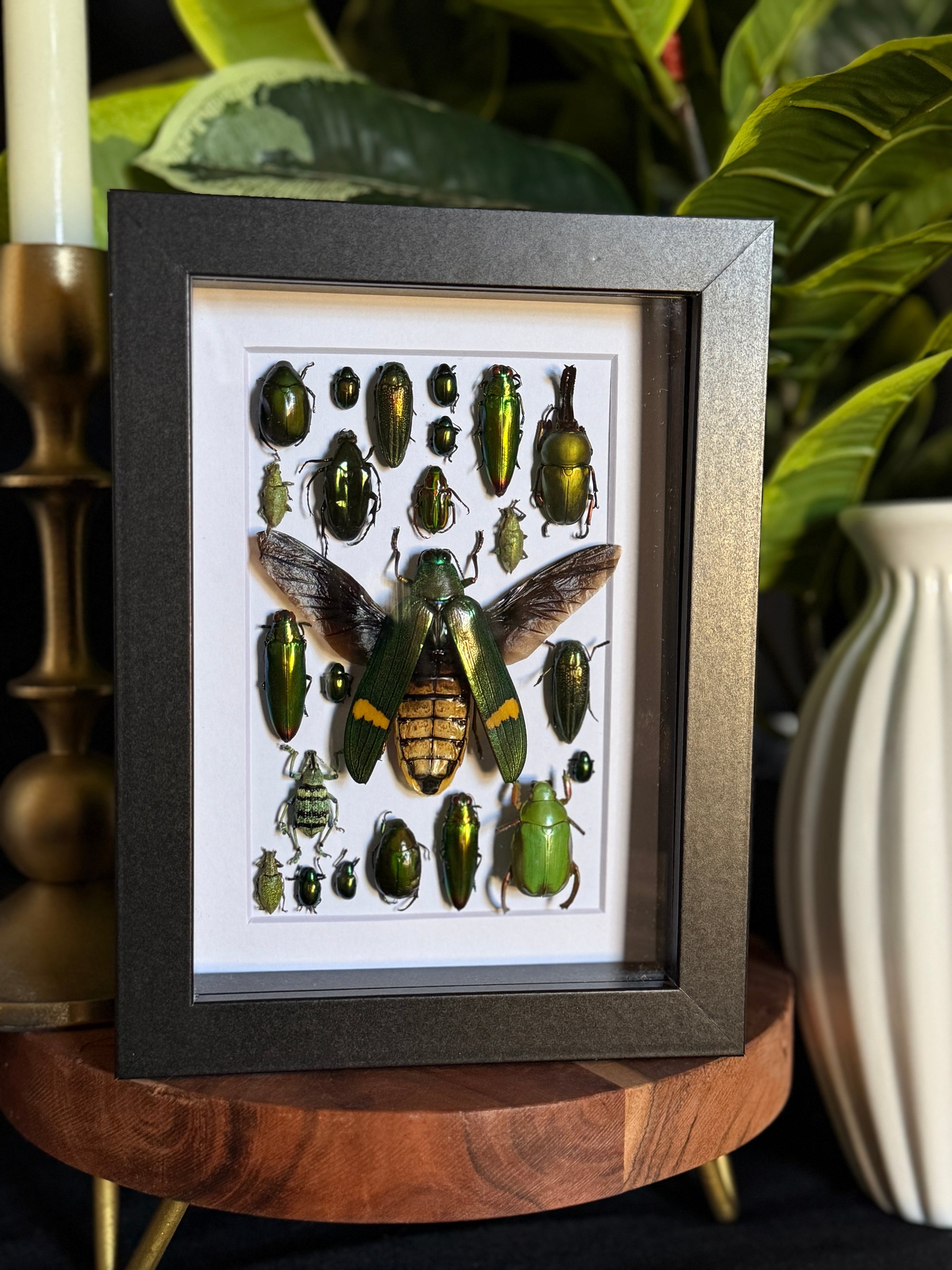 5X7 black frame featuring an array of stunning beetles