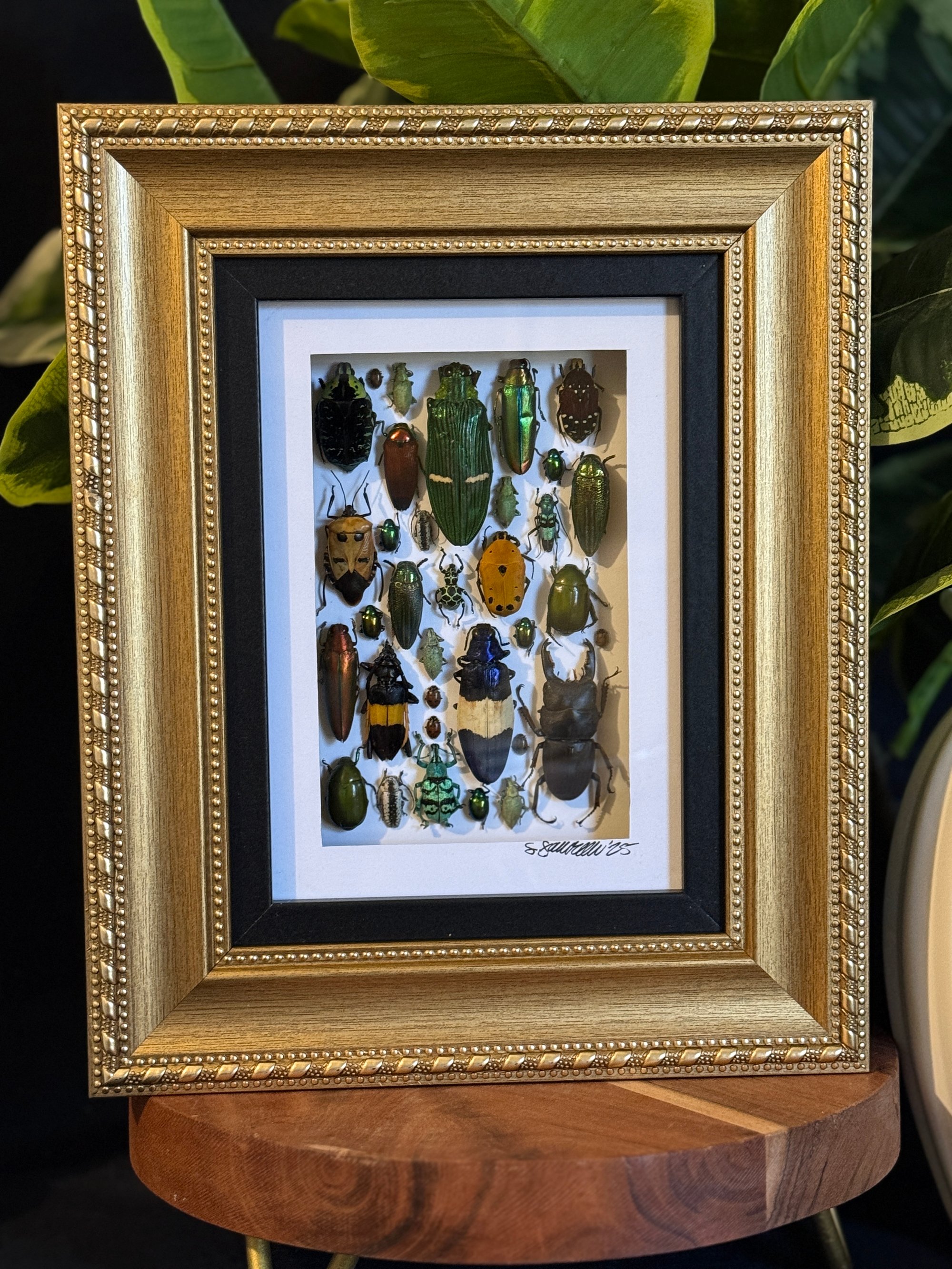 ROUGHLY 5X7 BLACK AND GOLD FRAME FEATURING A VARIETY OF BEETLES