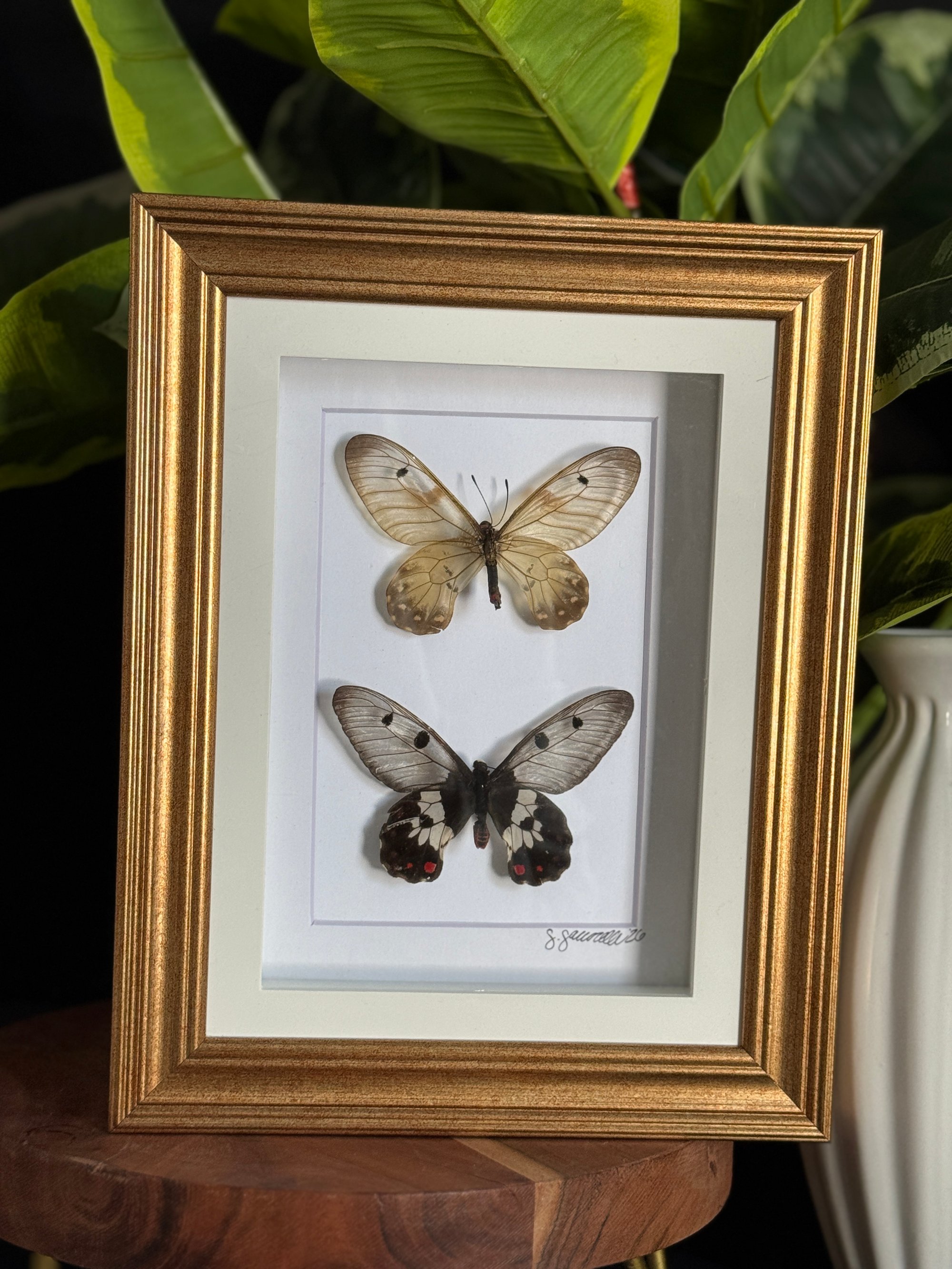 Roughly 7x9 gold frame featuring a female (top) and a male (bottom) Big Greasy butterflies