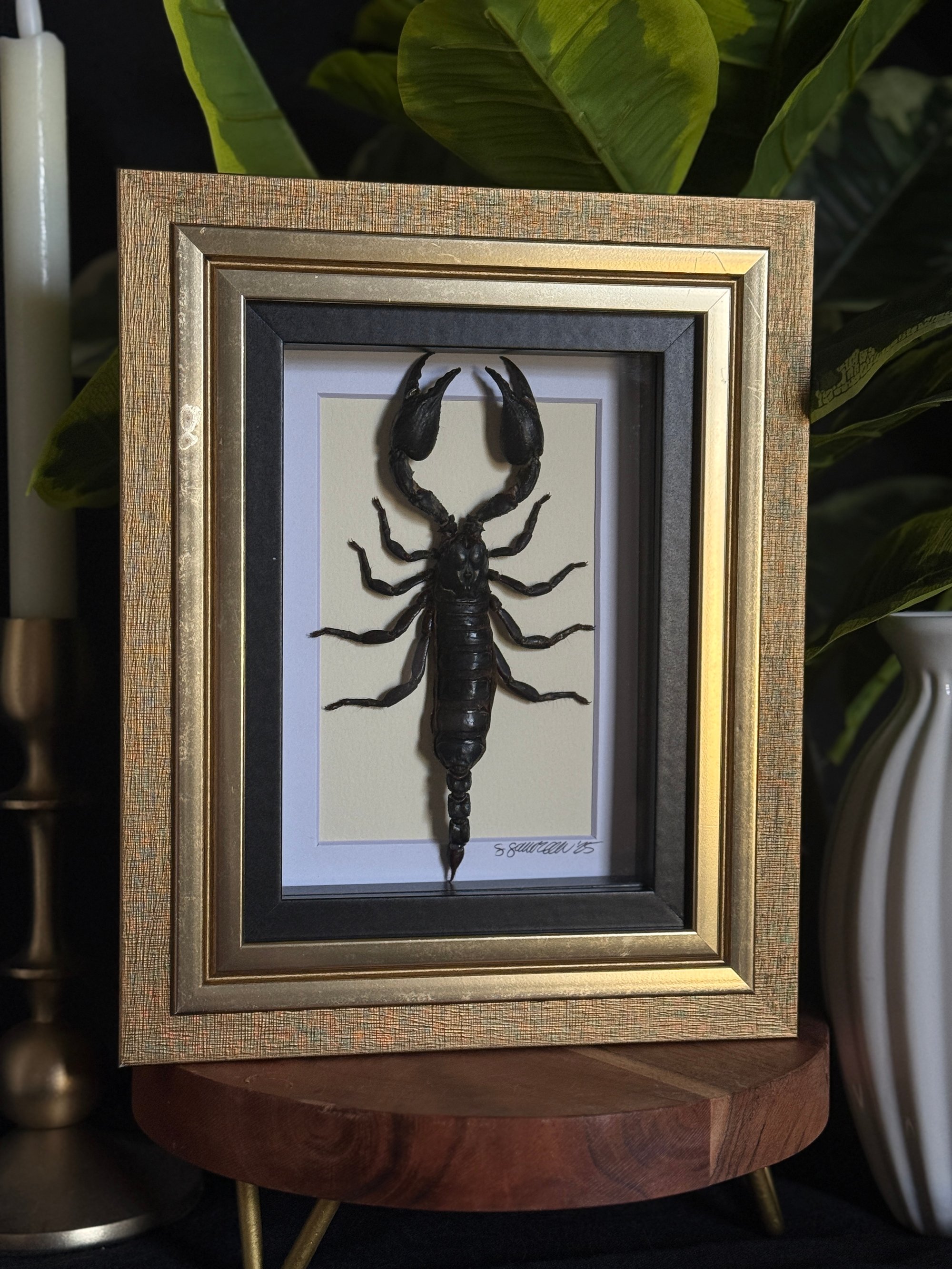 Roughly 5x7 black and gold frame featuring a giant forest scorpion