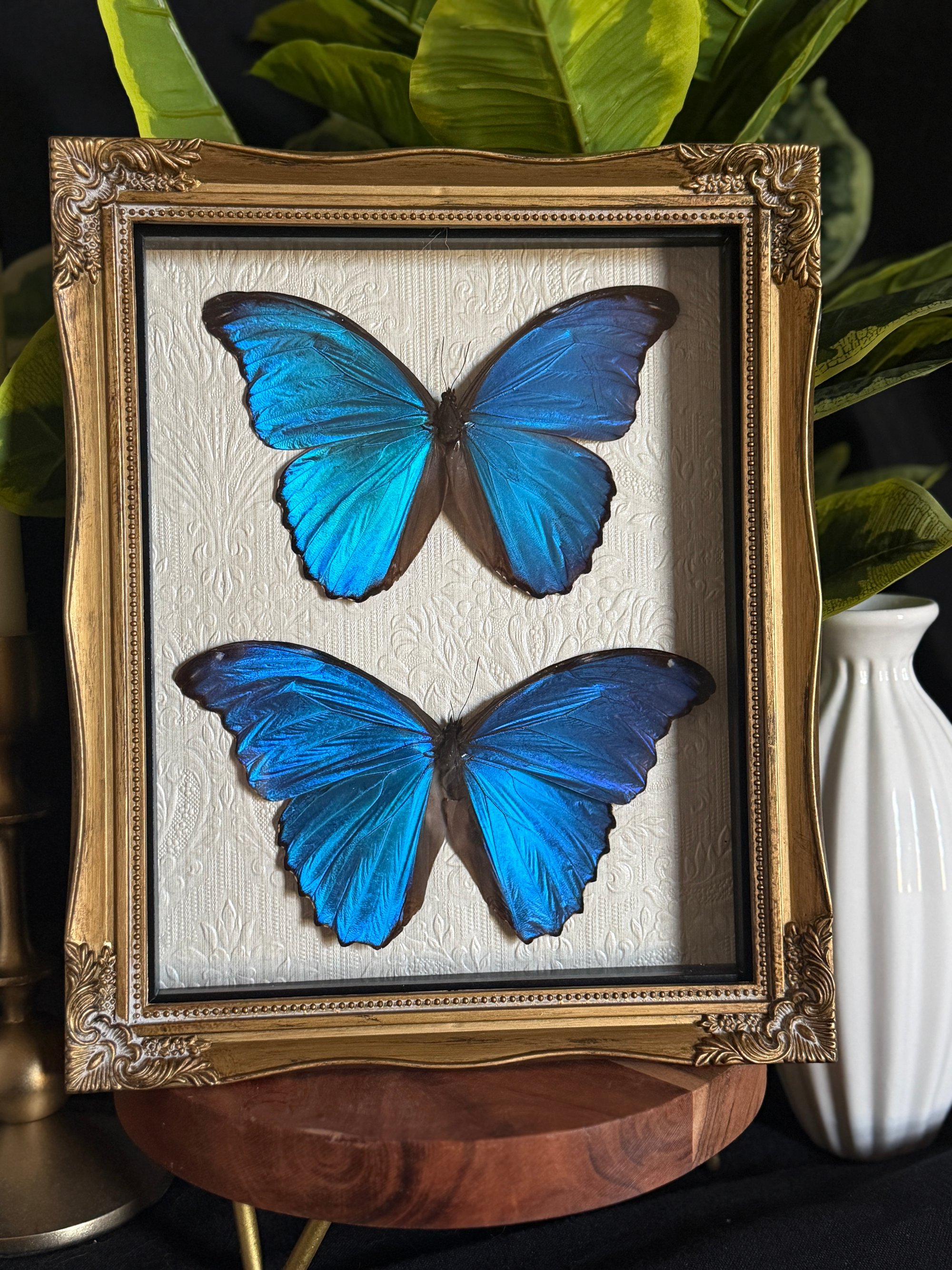 Roughly 8x10 antique gold ornate frame featuring two stunning blue morpho butterflies