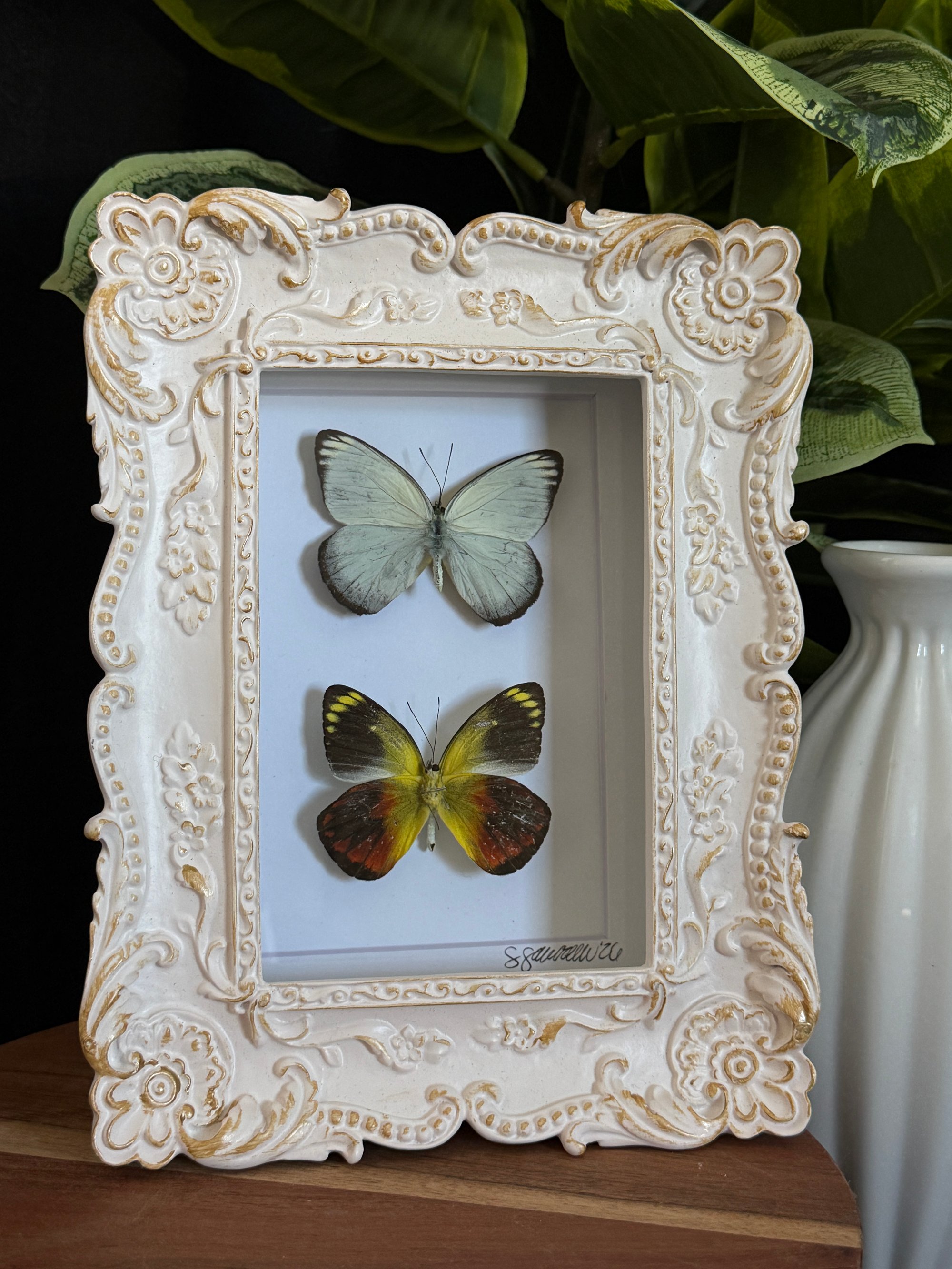 5X7 creamy white ornate frame featuring two Caenus Jezebel butterflies. The bottom butterfly is flipped upside down to showcase the underside of its wings