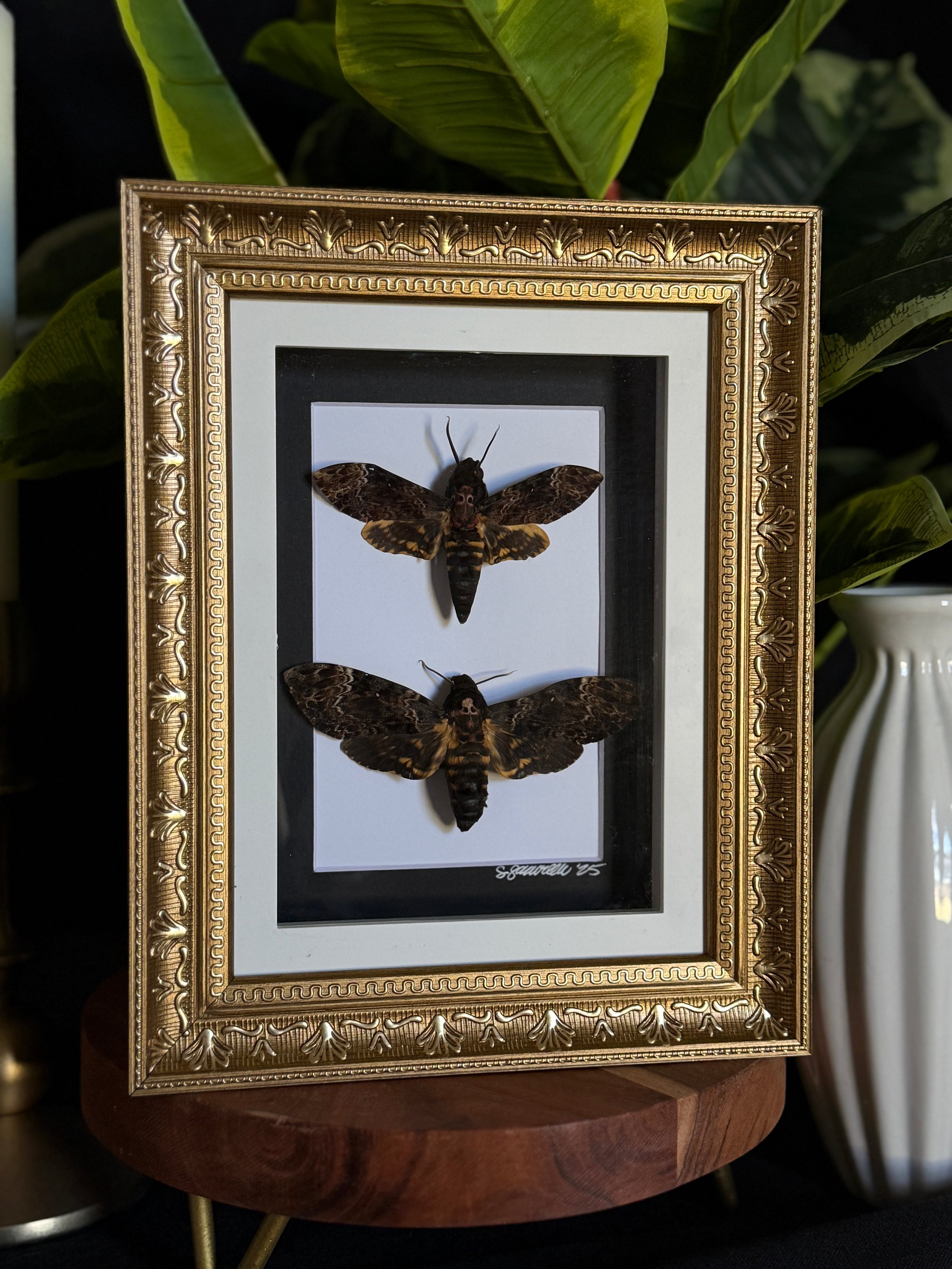 5X7 gold ornate frame featuring two stunning death head hawk moths