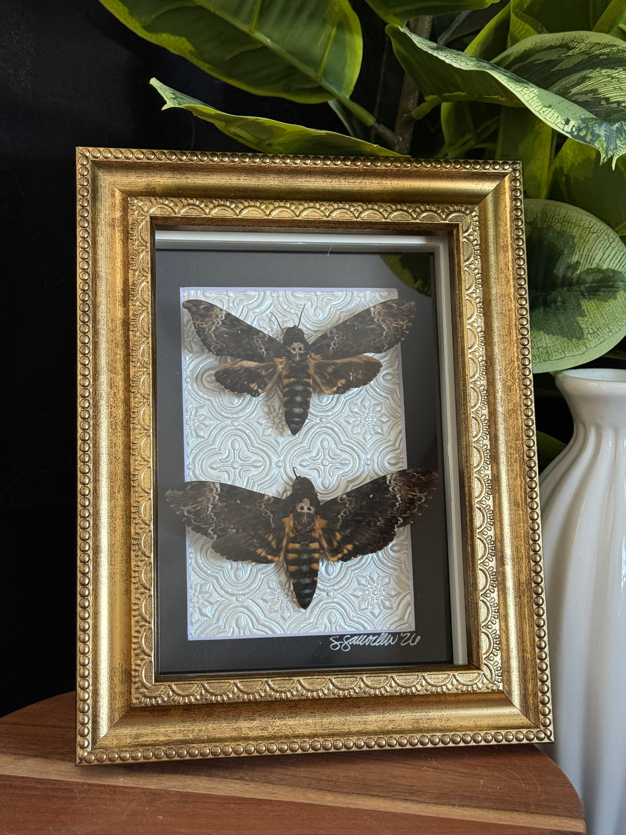 Roughly 7x9 gold ornate boho-ish frame featuring two death head hawk moths