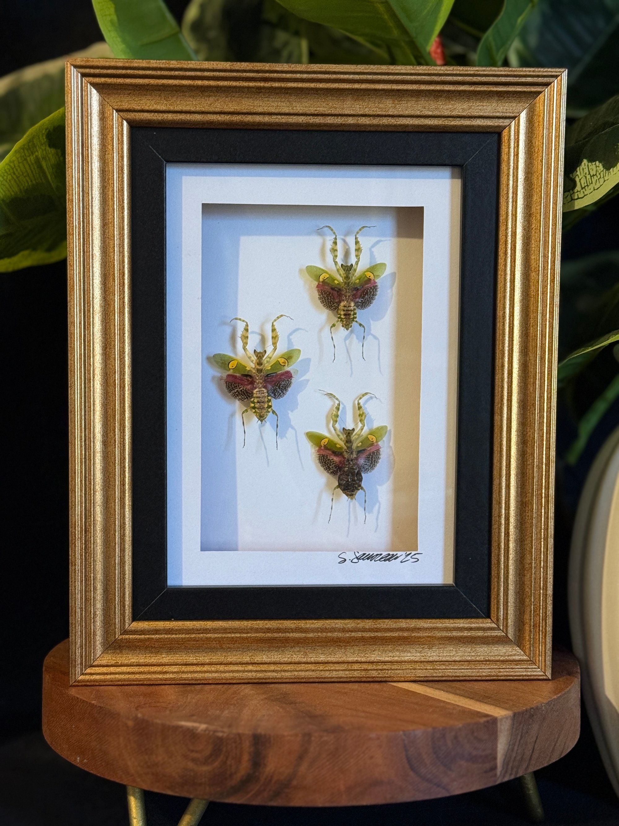 ROUGHLY 5X7 BLACK AND GOLD FRAME FEATURING THREE FLOWER MANTIS