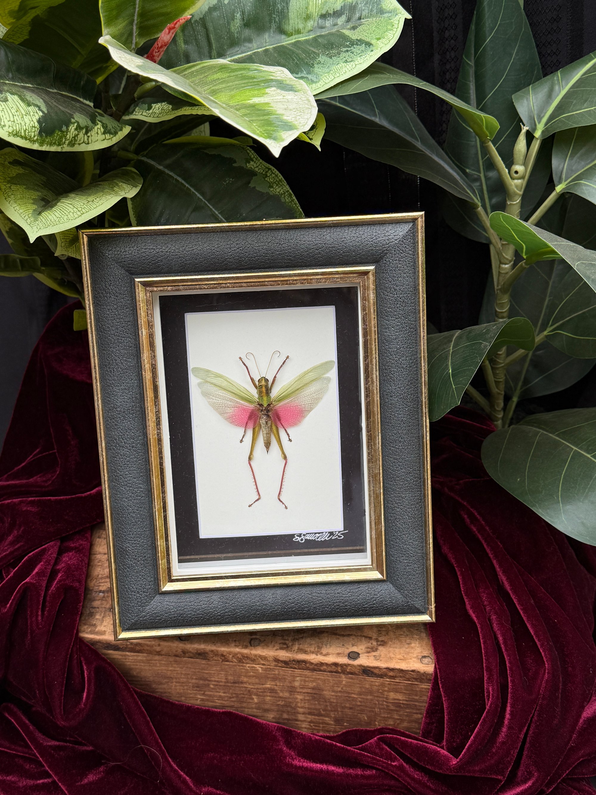 5X7 LEATHERED FRAME FEATURING A STUNNING PINK AND GREEN INDONESIAN GRASSHOPPER
