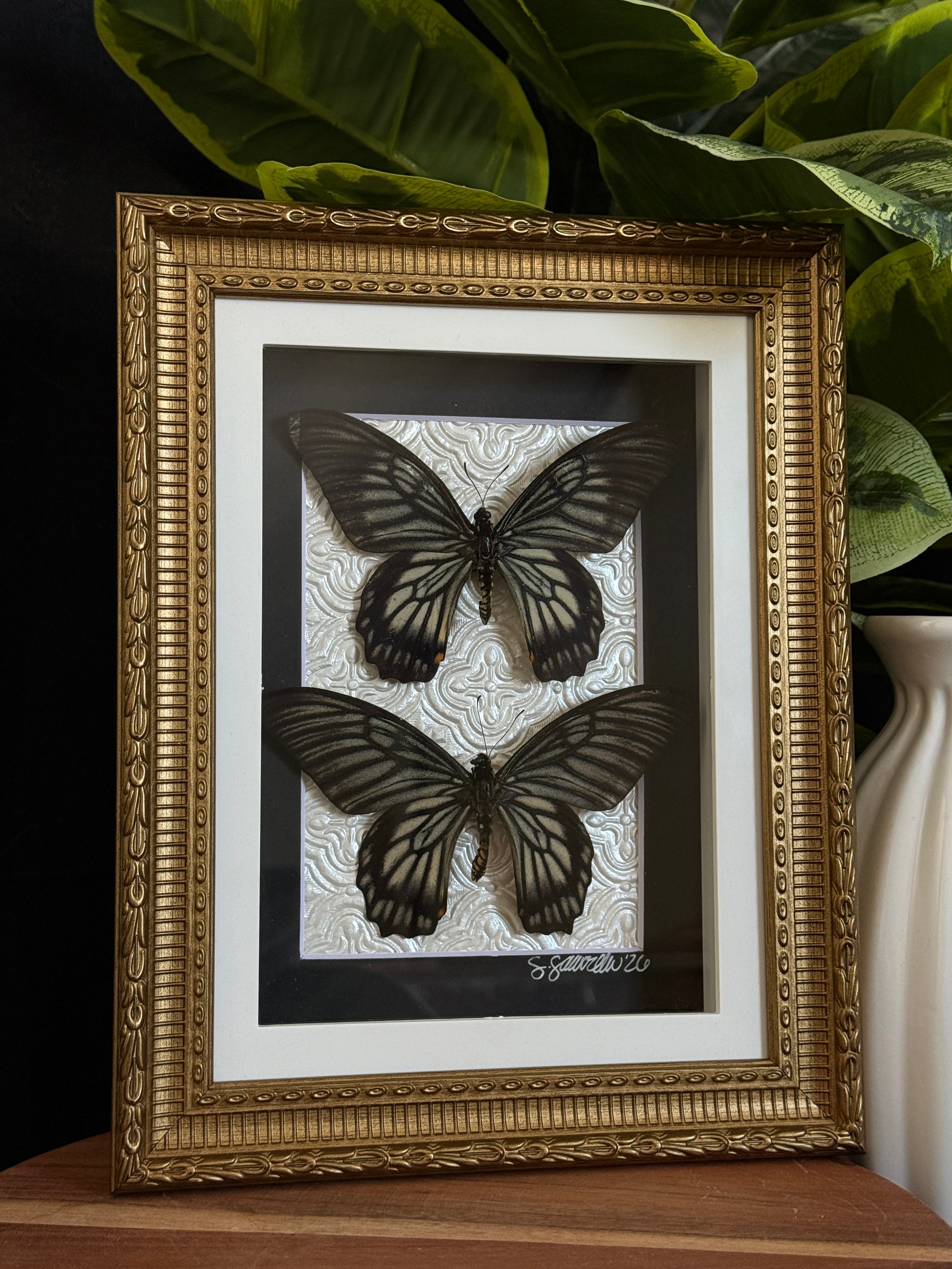 Roughly 7x9 gold ornate frame featuring two ghost swallowtails set on an embossed white background