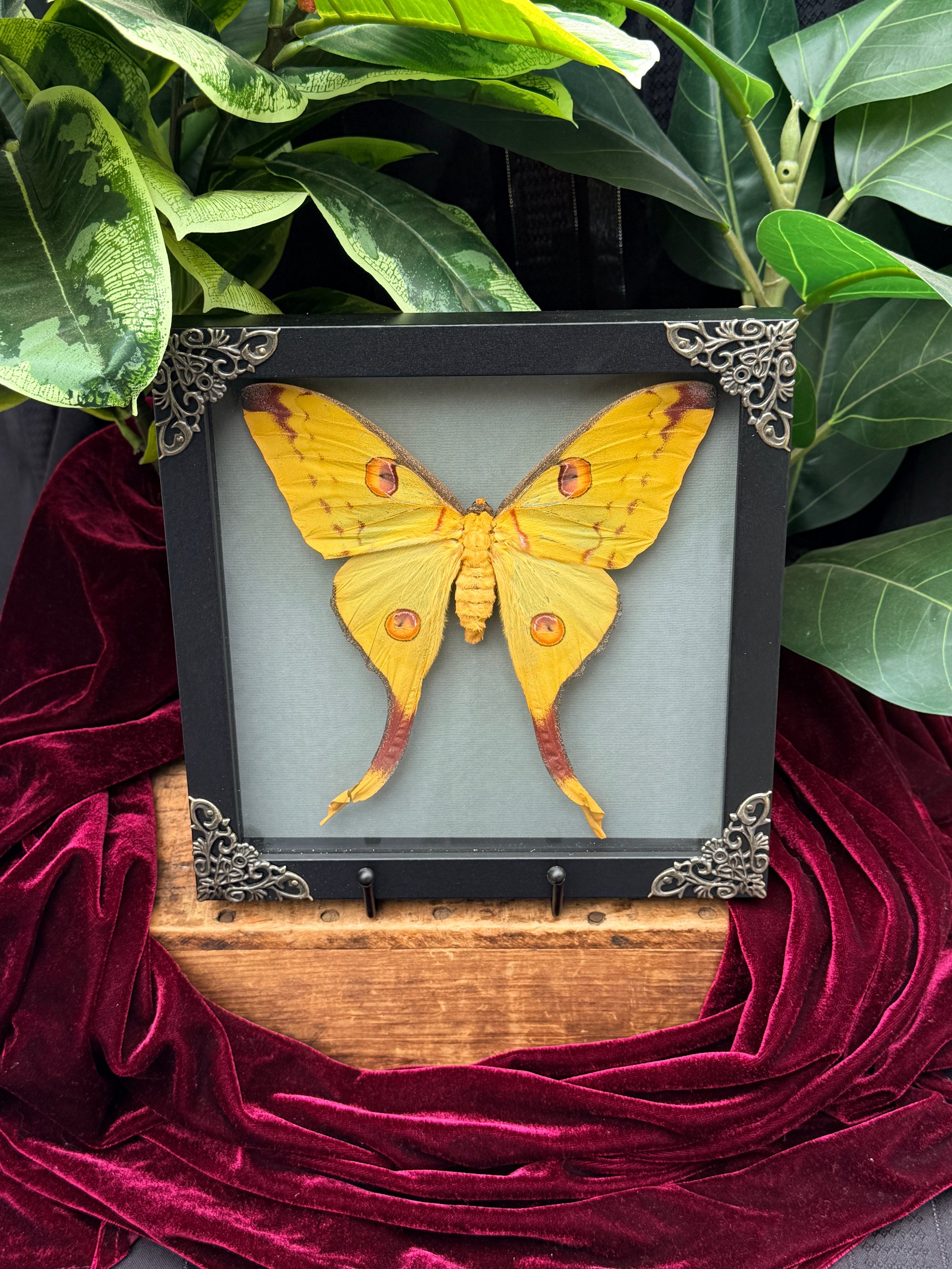 8X8 FRAME FEATURING A STUNNING FEMALE MADAGASCAN MOON MOTH WITH METAL CORNER EMBELLISHMENTS