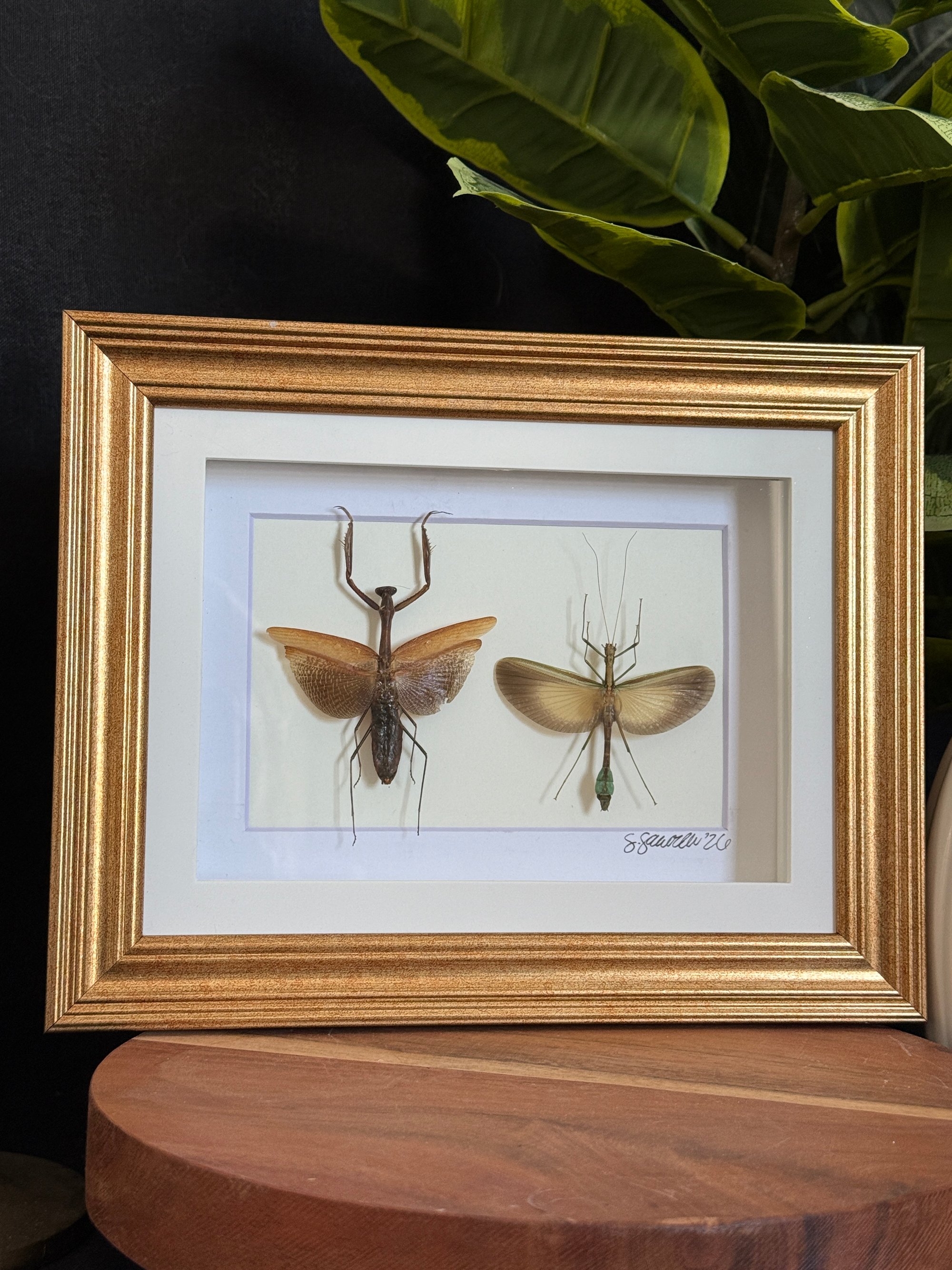 Roughly 7x9 gold frame featuring an asian jumping mantis alongside a stick insect