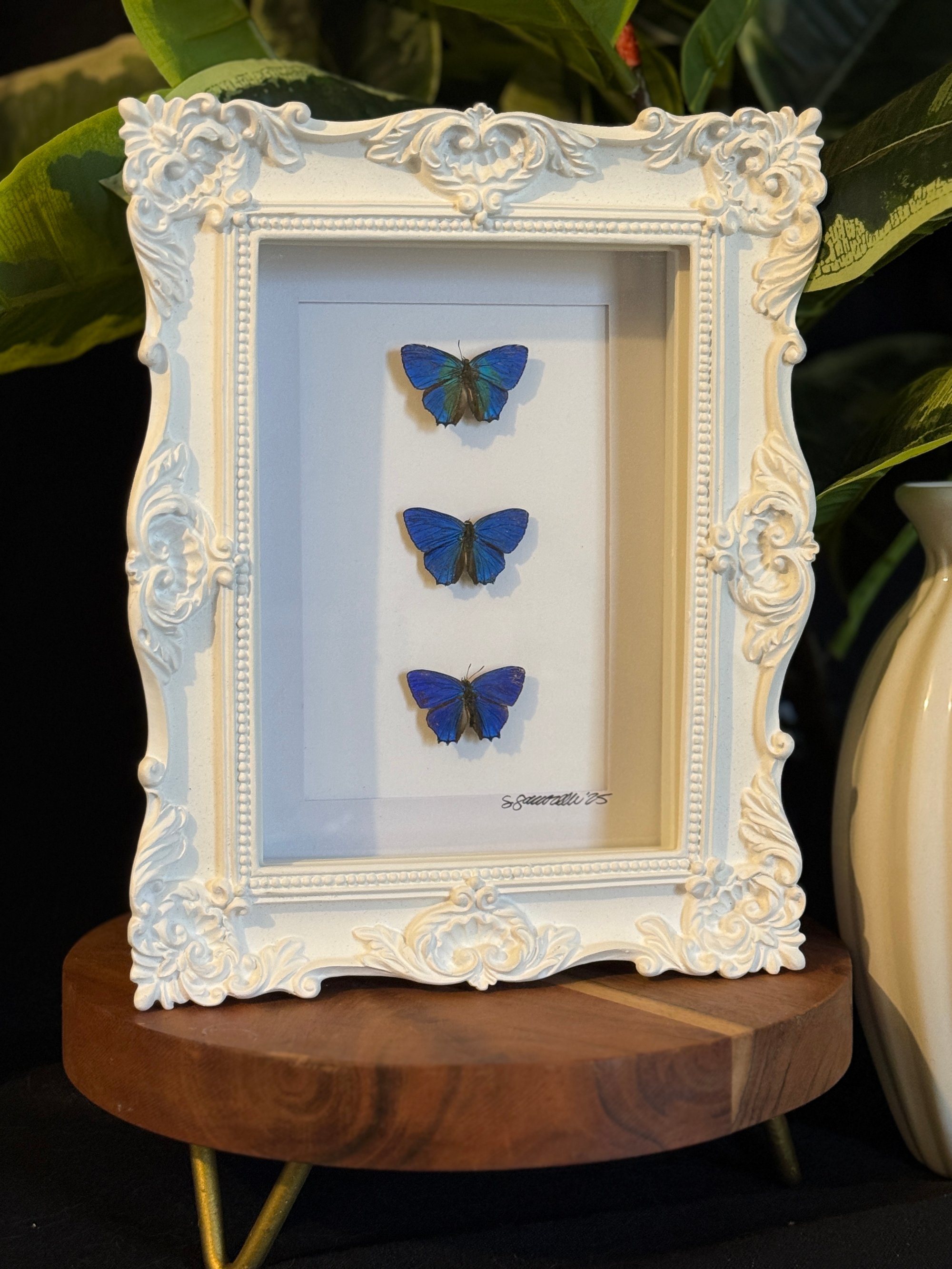 5X7 WHITE ORNATE FRAME FEATURING THREE METALLIC BLUE BUTTERFLIES