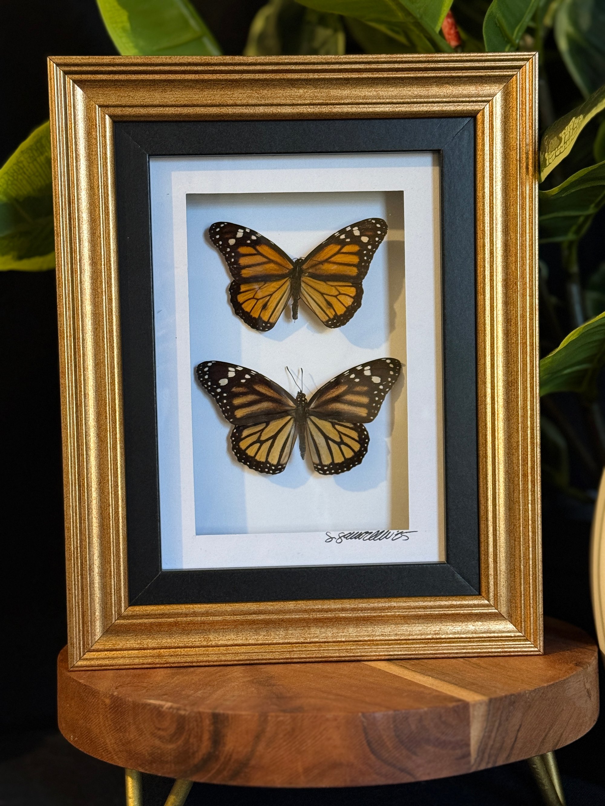 ROUGHLY 5X7 GOLD AND BLACK FRAME FEATURING TWO MONARCH BUTTERFLIES
