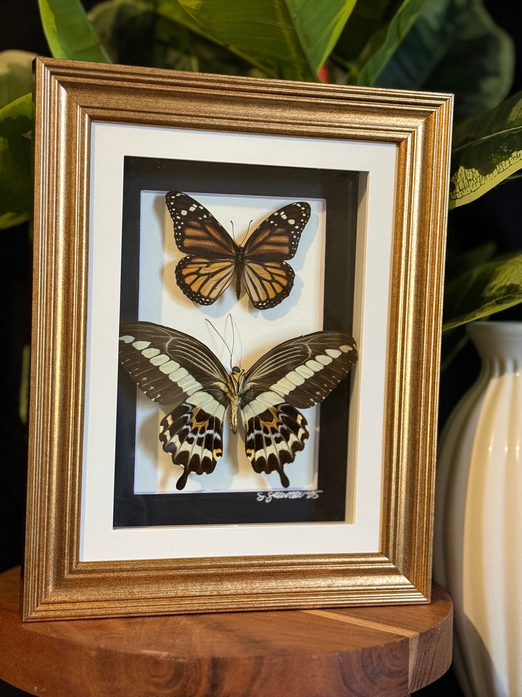 ROUGHLY 5X7 GOLD FRAME FEATURING A MALE MONARCH AND A SWALLOWTAIL (FLIPPED UPSIDE DOWN TO SHOWCASE THE UNDERSIDE OF ITS WINGS)