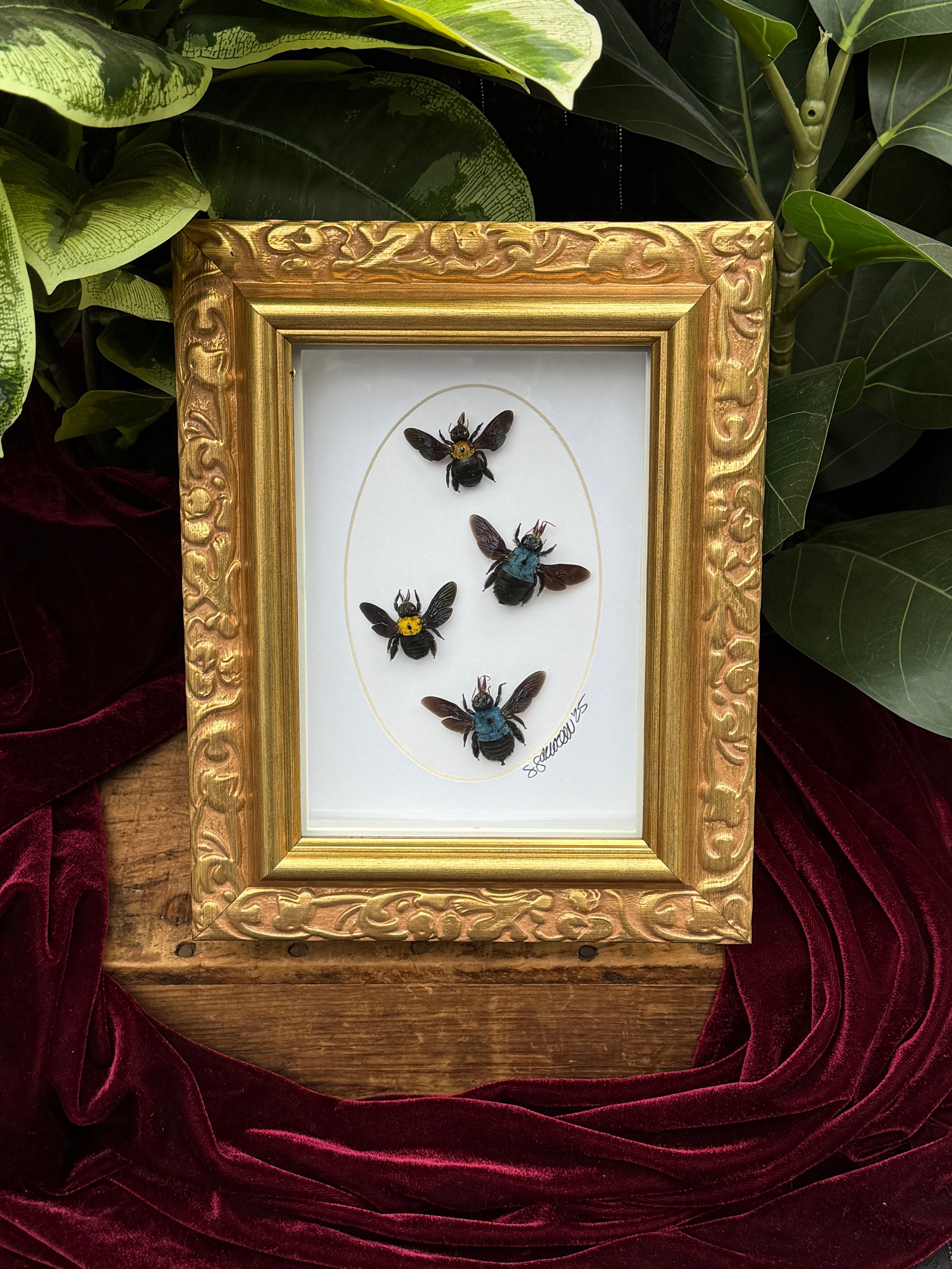 5X7 GOLD ORNATE FRAME FEATURING TWO YELLOW CARPENTER BEES AND TWO BLUE CARPENTER BEES