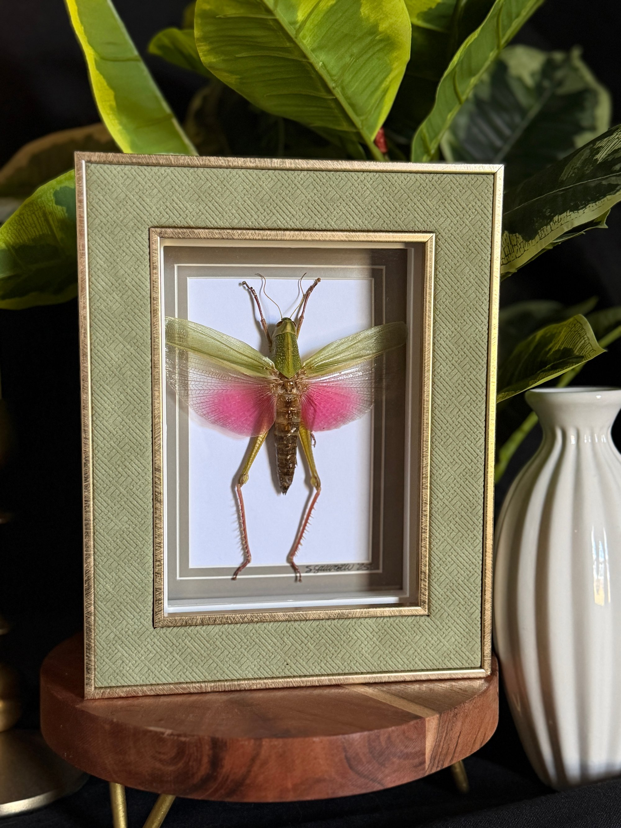 5X7 green fabric frame featuring a stunning pink/green winged grasshopper