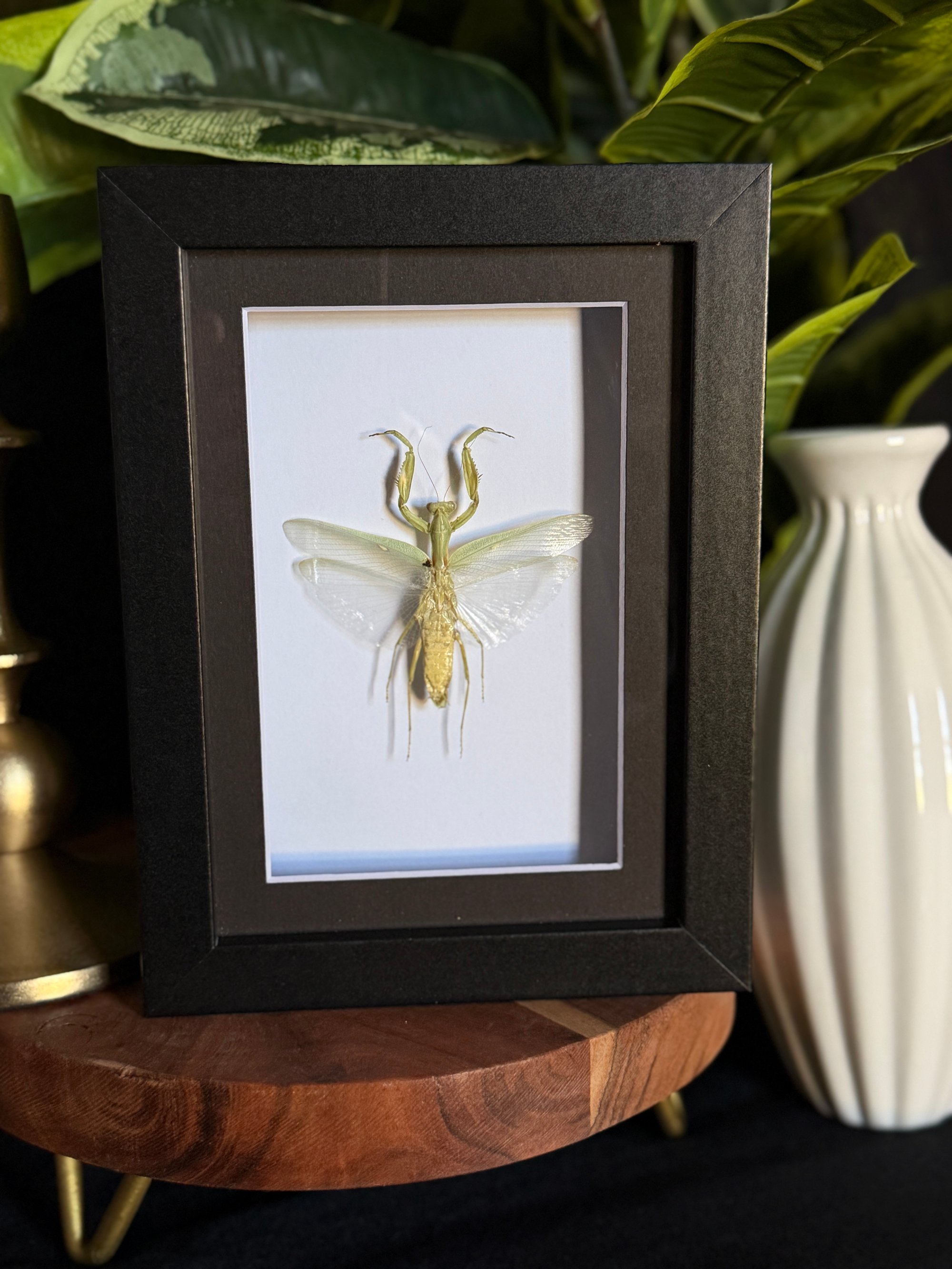 5X7 black frame featuring a spread praying mantis