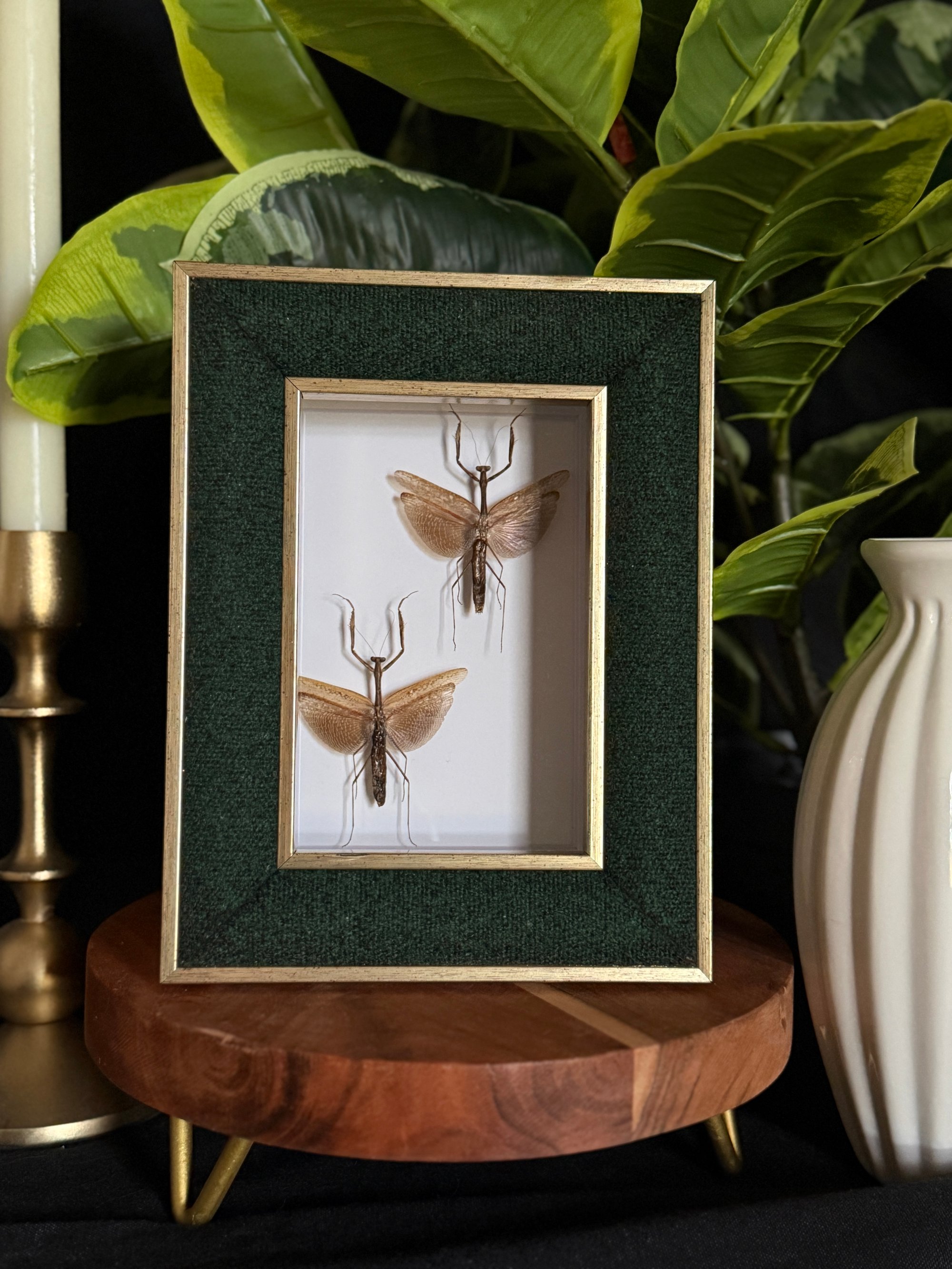 5X7 dark green fabric frame featuring two indonesian praying mantis
