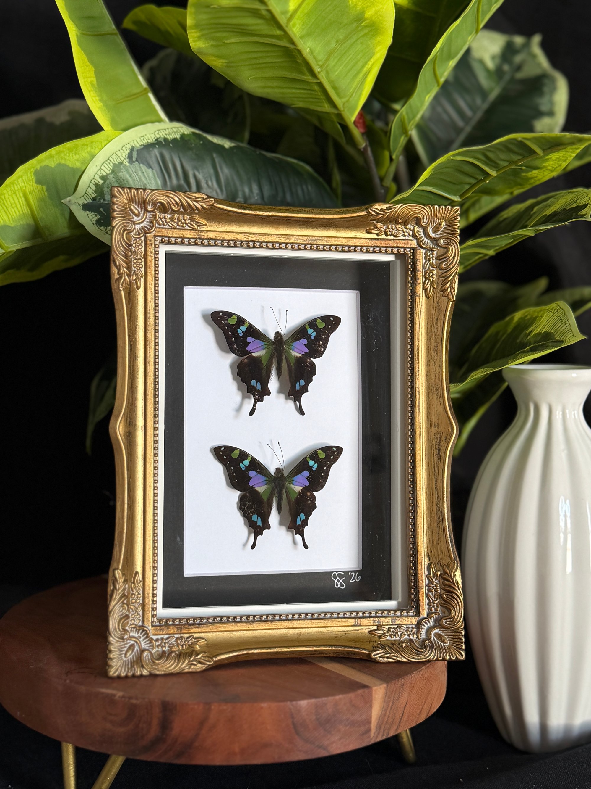 5x7 gold ornate frame featuring two purple spotted swallowtails