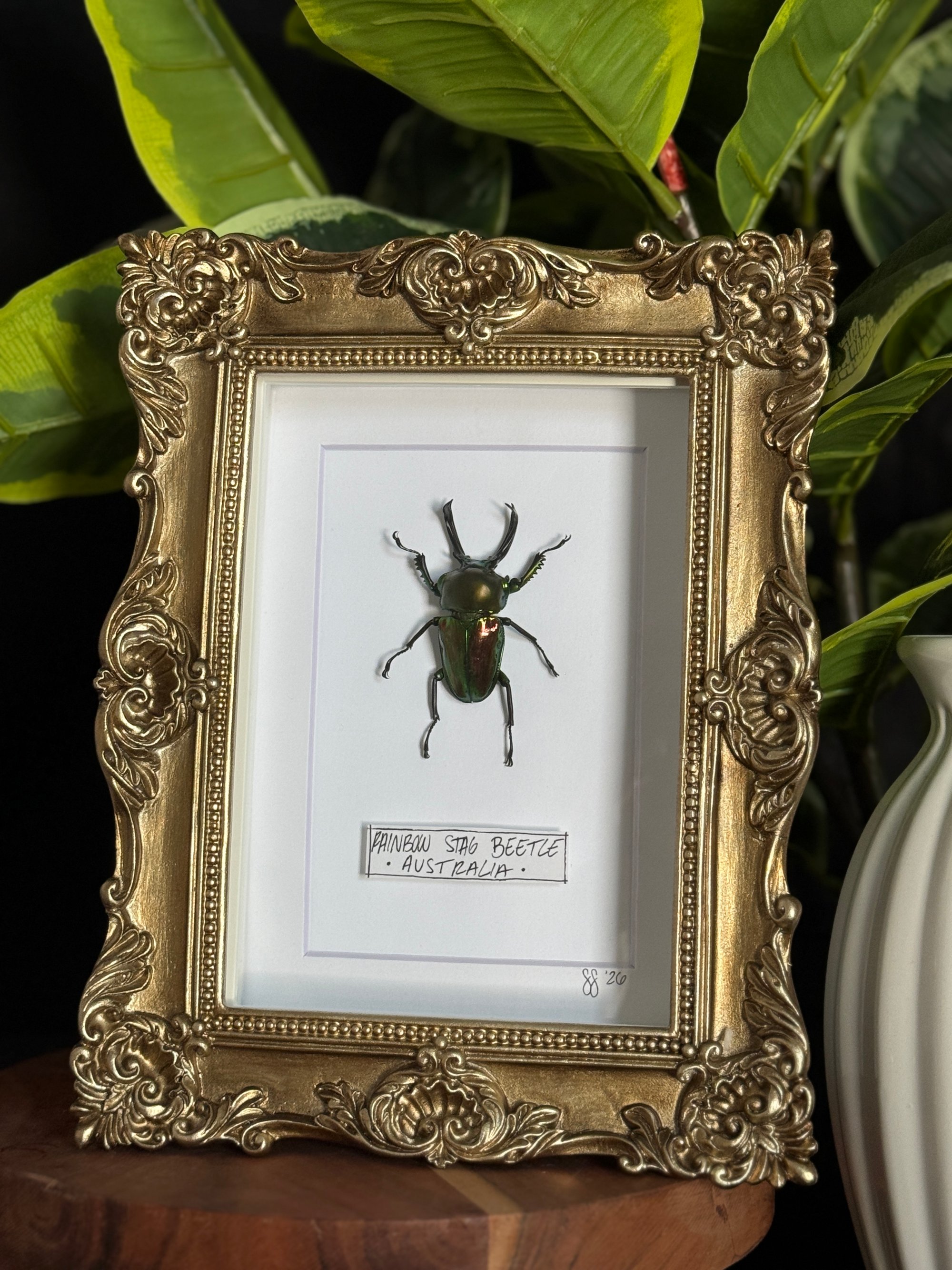 5x7 gold ornate frame featuring a stunning and rare rainbow stag beetle
