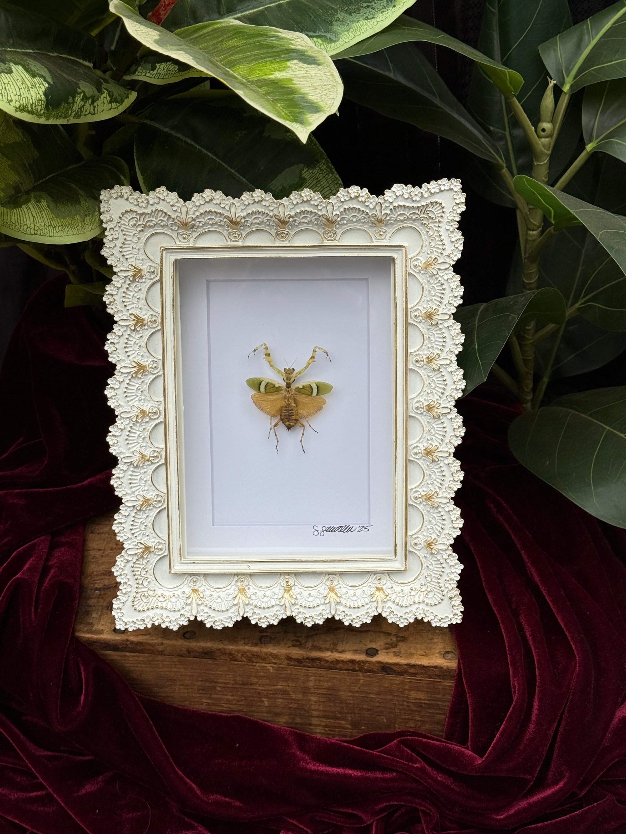 5X7 GOLD AND WHITE FRAME FEATURING A BANDED FLOWER MANTIS